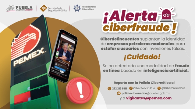 CIUDAD DE PUEBLA, Pue. –Enero 10 del 2024.-A fin de coadyuvar a la prevención de ciberdelitos, el gobierno presente de Sergio Salomón, a través de la Secretaría de Seguridad Pública (SSP), alerta a internautas sobre la difusión de contenido falso en redes sociales para realizar inversiones económicas en Petróleos Mexicanos (PEMEX).