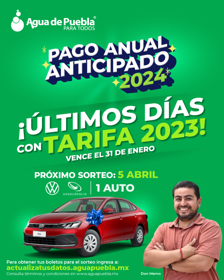 PUEBLA.-Enero 28 del 2024.-Agua de Puebla para Todos informa que el próximo miércoles 31 de enero es el último día para realizar el Pago Anual Anticipado 2024 con tarifas del año 2023 y no habrá prórroga de este beneficio.