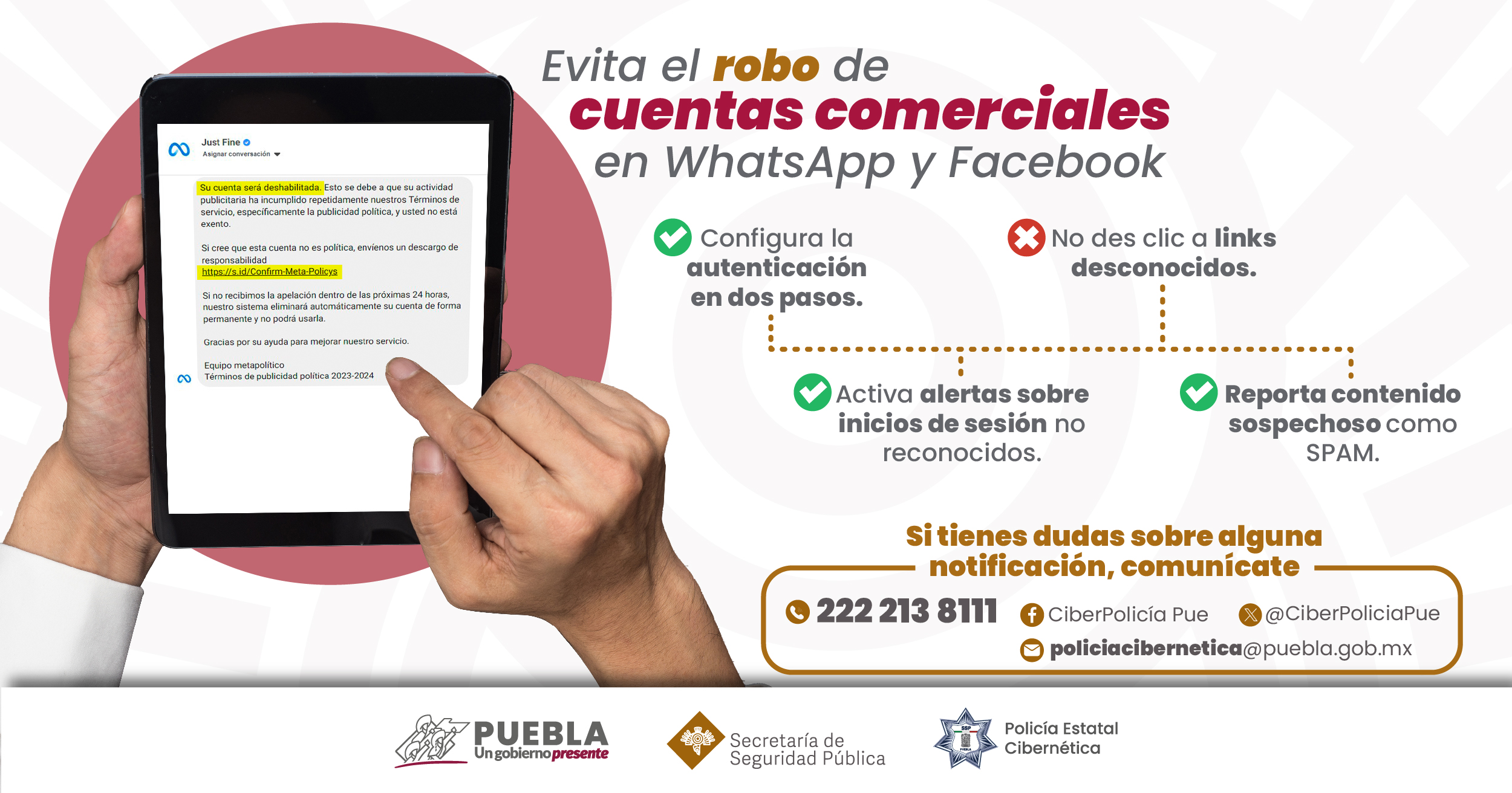 CIUDAD DE PUEBLA, Pue. – El gobierno presente de Sergio Salomón, a través de la Secretaría de Seguridad Pública (SSP), exhorta a la sociedad a reforzar medidas preventivas para evitar el robo de cuentas empresariales en WhatsApp y páginas comerciales en Facebook.