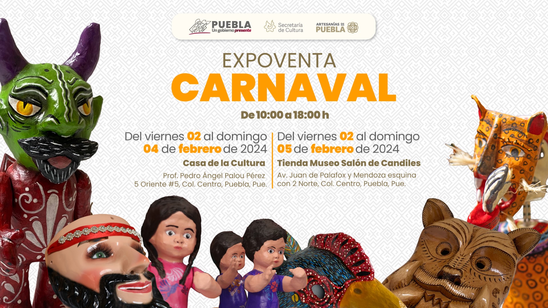 CIUDAD DE PUEBLA, Pue.- Como parte de la programación de la “Primera Muestra Carnavalera de Puebla”, impulsada por el gobierno presente de Sergio Salomón, la Secretaría de Cultura llevará a cabo la expoventa artesanal “Carnaval” para promover productos alusivos a dicha temática elaborados en el interior del estado.