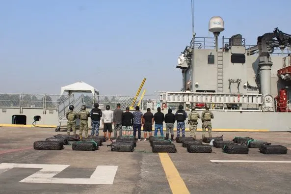 Lázaro Cárdenas, Michoacán. – La Secretaría de Marina a través de la Armada de México, en funciones de Guardia Costera, informa que en días pasados, personal de la Décima Cuarta Zona Naval, con sede en Lázaro Cárdenas Michoacán, aseguró dos embarcaciones menores con motores fuera de borda, con 21 bultos, las cuales contenían aproximadamente una tonelada y media de una sustancia con características similares a la cocaína; asimismo, fueron detenidos siete presuntos infractores de la ley a aproximadamente 120 millas náuticas (222 kilómetros) al Suroeste de ese puerto.