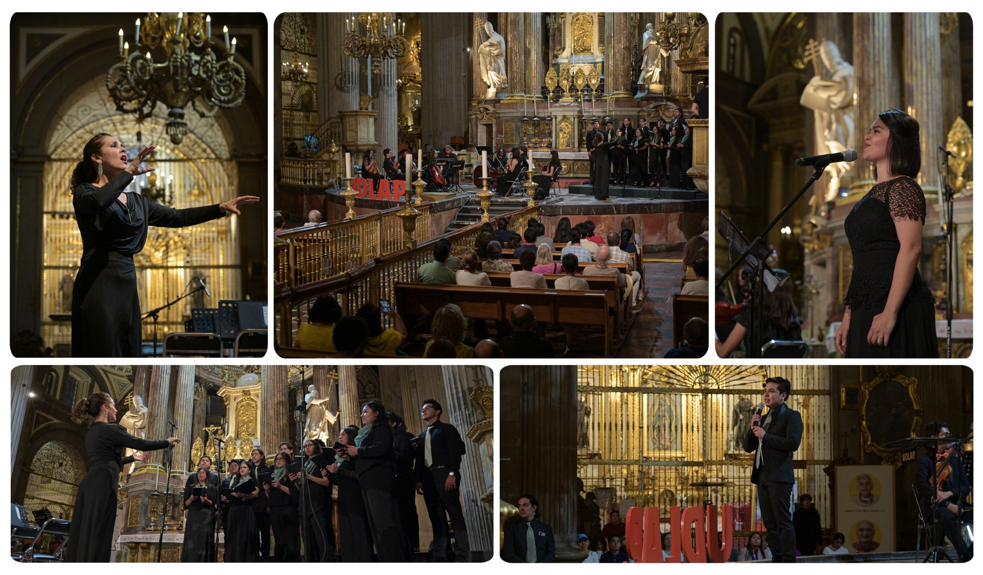 Cholula, Puebla; a 12 de abril de 2024.- La Orquesta Symphonia, el Coro de Cámara, así como dos cantantes de Ópera de la Universidad de las Américas Puebla (UDLAP) y la mezzosoprano Paola Gutiérrez Candia, brindaron el Concierto de Pascua realizado en el marco de los 375 años de la consagración de la Catedral Basílica de Puebla y las festividades de Pascua.
