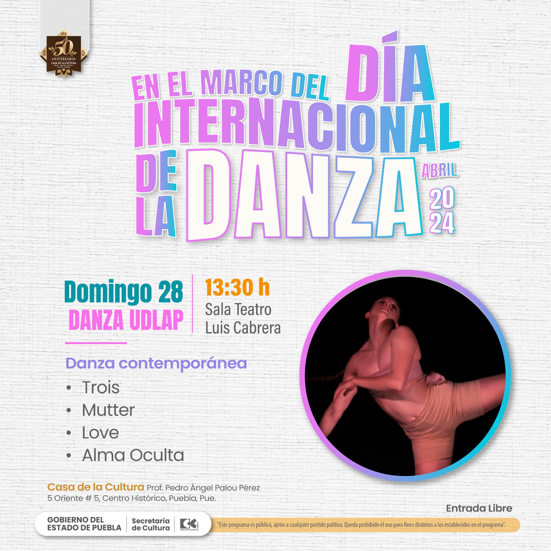 CIUDAD DE PUEBLA, Pue.- En el marco del Día Internacional de la Danza (29 de abril), la Casa de la Cultura «Profesor Pedro Ángel Palou Pérez» (5 Oriente número 5, Centro Histórico) ha programado cuatro eventos los días 27, 28 y 30 del mismo mes, informa la Secretaría de Cultura.