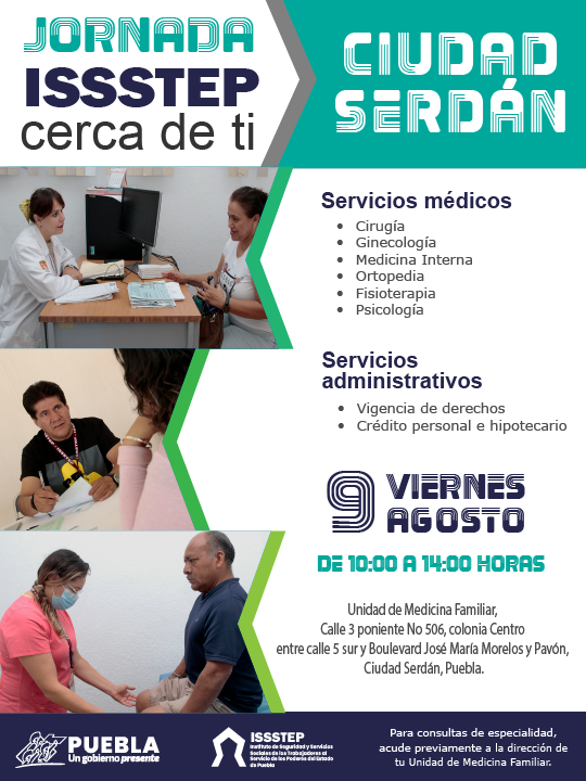 CIUDAD DE PUEBLA, Pue., Como parte del gobierno presente de Sergio Salomón, que privilegia el acercamiento de servicios que generan bienestar a la población, el Instituto de Seguridad y Servicios Sociales de los Trabajadores al Servicio de los Poderes del Estado de Puebla informa que el próximo viernes 9 de agosto realizará la séptima jornada de atención “ISSSTEP cerca de ti”, para beneficiar a la derechohabiencia de Ciudad Serdán.