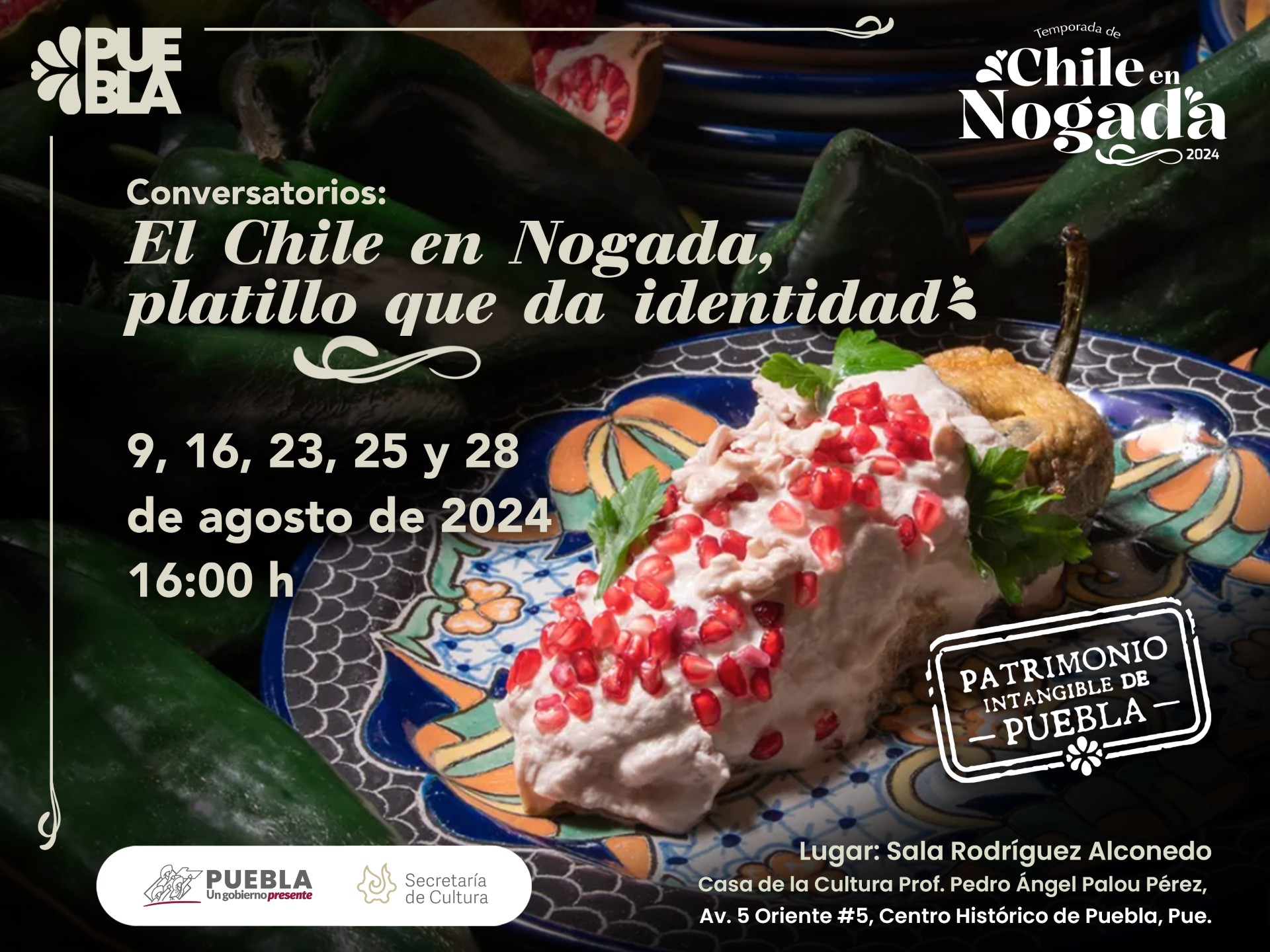 CIUDAD DE PUEBLA, Pue. –  Para promover y preservar una de las tradiciones culinarias más representativas del estado, el gobierno presente de Sergio Salomón, a través de la Secretaría de Cultura, desarrollará el ciclo de conferencias “El Chile en Nogada, patrimonio e identidad” en la Casa de la Cultura “Profesor Pedro Ángel Palou Pérez” (5 Oriente número 5, Centro Histórico).