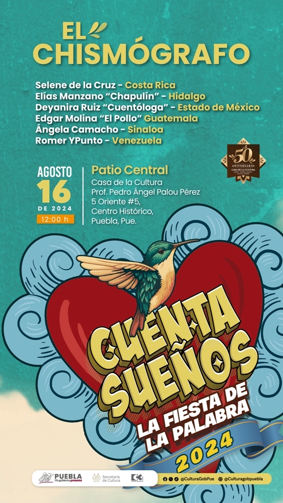 CIUDAD DE PUEBLA, Pue. – Agosto 15 del 2024.-Este 16 de agosto iniciará en Puebla el Festival Internacional “Cuenta Sueños. La Fiesta de la Palabra” 2024, a través del cual, el gobierno presente de Sergio Salomón, por medio de la Secretaría de Cultura, llevará a cabo diversas actividades en torno a la palabra oral, la literatura, las artes y la escucha en la Casa de la Cultura “Profesor Pedro Ángel Palou Pérez” y el Centro Cultural “San Roque”.