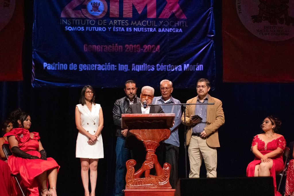Aquiles Córdova Morán, agradeció a los jóvenes por haberlo invitado a ser parte de este festejo y los llamó a crear arte: “solo un hombre culto y educado puede crear un arte eficaz para lograr el objetivo que su creador se propone. No se conformen con repetir lo que les enseñaron deben hacer trabajo artístico, es necesario que empecemos a pensar en crear creadores, es decir en gente que sobre la base de lo que aprendió en la Macuil Xóchitl construya su propia manera de expresar sus sentimientos y sus ideas artísticas a través de la técnica, modificándola, superándola y adecuándola al mensaje que él quiere transmitir a la gente”.