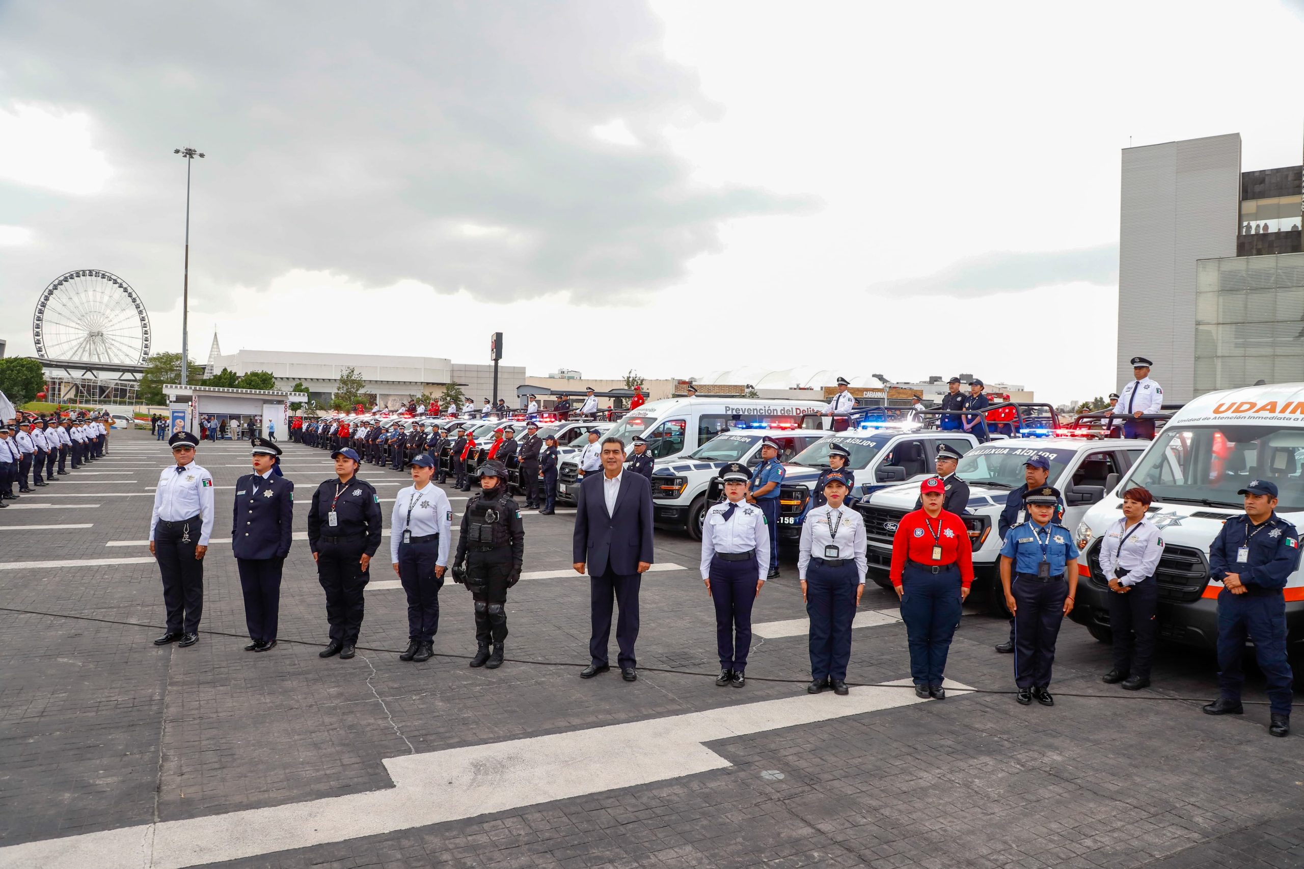 En este acto, el gobernador Sergio Salomón entregó 100 patrullas, 968 chalecos balísticos y 4 mil 153 kits de uniformes a la Policía Estatal, 10 unidades para prevención del delito y para el área de atención inmediata a mujeres; 850 patrullas, 2 mil 222 chalecos balísticos y armamento a municipios, además de reconocimientos por años de servicio a personal policíaco y a 494 cadetes del curso de Policía Estatal de Proximidad. Asimismo, 50 patrullas, una ambulancia, un autobús, 7 mil 400 uniformes y 50 más de maternidad a elementos de la Corporación Auxiliar de Policía de Protección Ciudadana.