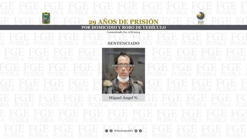 Puebla, Pue.- Diciembre 29 del 2024.- Al acreditar su responsabilidad en los delitos de homicidio calificado y robo de vehículo, la Fiscalía General del Estado logró que se dictara sentencia de más de 29 años de prisión contra Miguel Ángel N.
