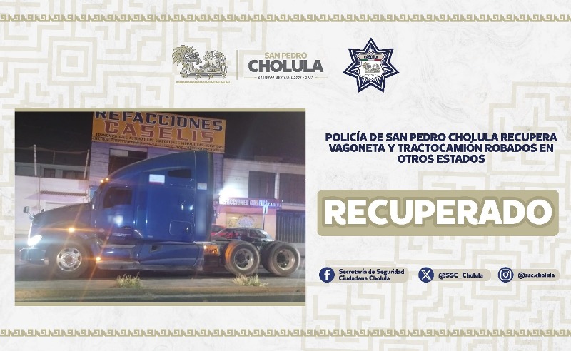 San Pedro Cholula, Puebla.- a 30 de diciembre del 2024.- Como resultado de recorridos de vigilancia, elementos de la Secretaría de Seguridad Ciudadana de San Pedro Cholula (SSC Cholula) recuperaron en dos hechos distintos, un tractocamión y una vagoneta, que habían sido robadas en otras entidades federativas, asegurando a Alfredo “N” de 64 , por el presunto delito de detentación de vehículo con reporte de robo.