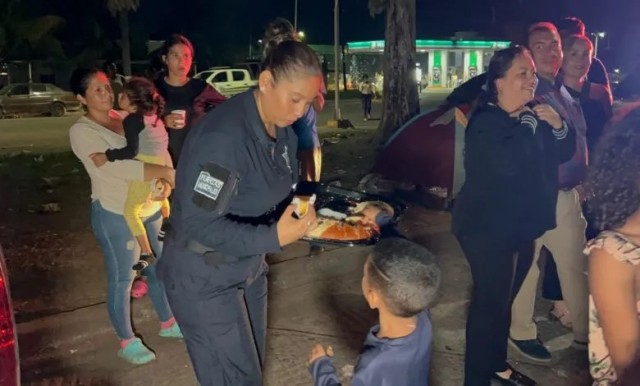 MÉXICO.- Enero 6 del 2025.-(EFE).-Policías municipales de Tapachula regalaron este lunes rosca de Reyes y chocolate caliente a migrantes que están varados en las calles.