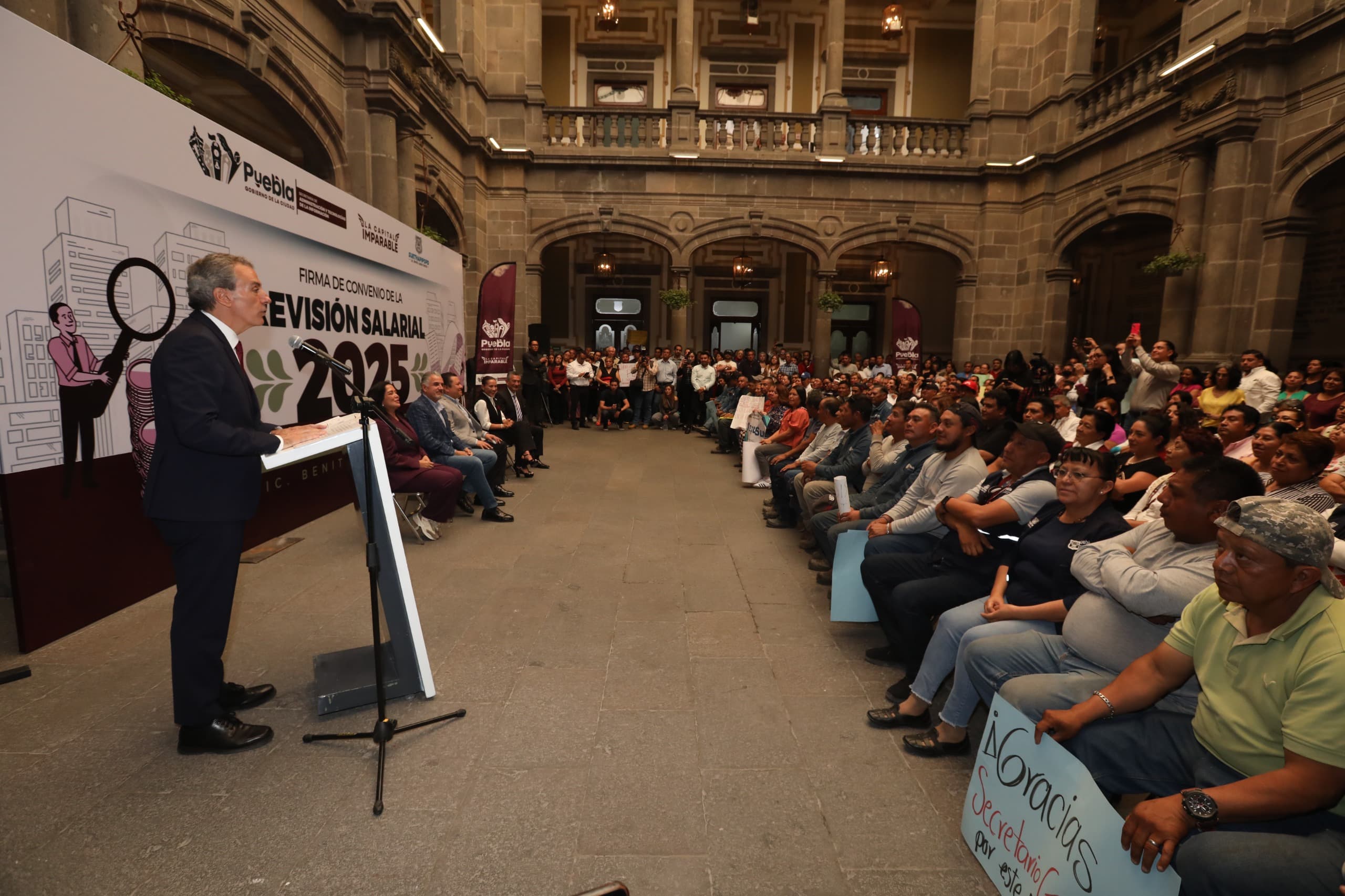 “Somos gente de palabra. Respetamos al Sindicato, como dijimos que lo íbamos a respetar desde el día uno; y así lo respetaremos hasta el día que me vaya que es en dos años 8 meses. Seguiremos trabajando de la mano de ustedes, porque son parte importante, ustedes son la cara del Ayuntamiento, así como todas las secretarías, tenemos gente que da la cara, ustedes son gente importantísima para el Ayuntamiento, tenemos que seguir trabajando para que a Puebla le vaya bien, para que al Sindicato le vaya bien”, expresó.