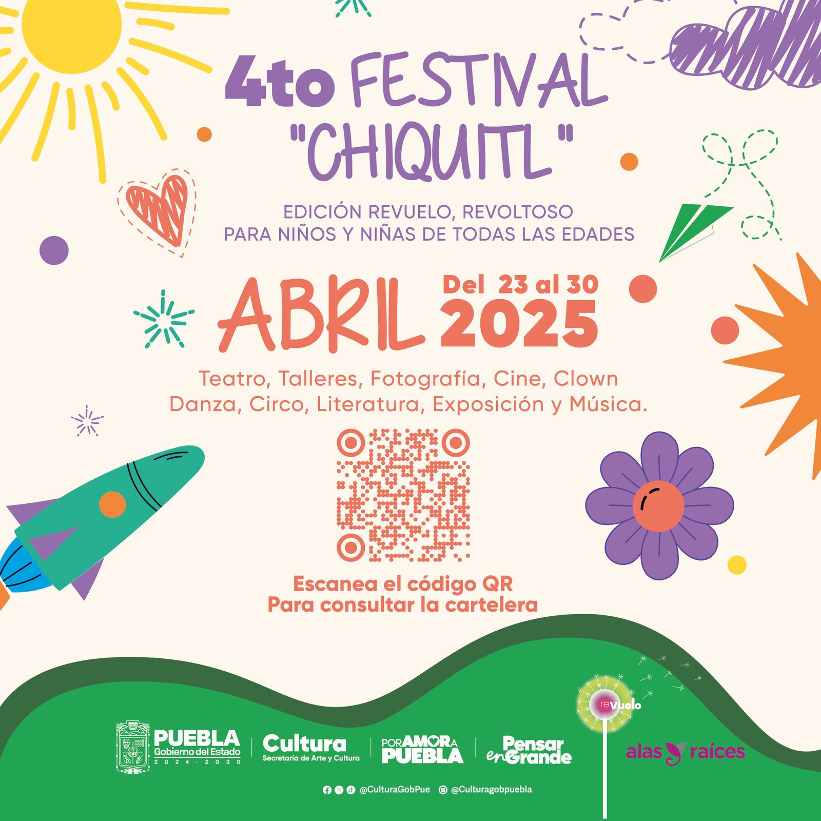 Esta edición lleva por nombre “Revuelo Revoltoso” y se realiza en conjunto con el programa de la Coordinación Nacional de Desarrollo Cultural Infantil: “Alas y Raíces”. Toda la programación está disponible para descarga en la página web de la Secretaría de Arte y Cultura: sc.puebla.gob.mx.
