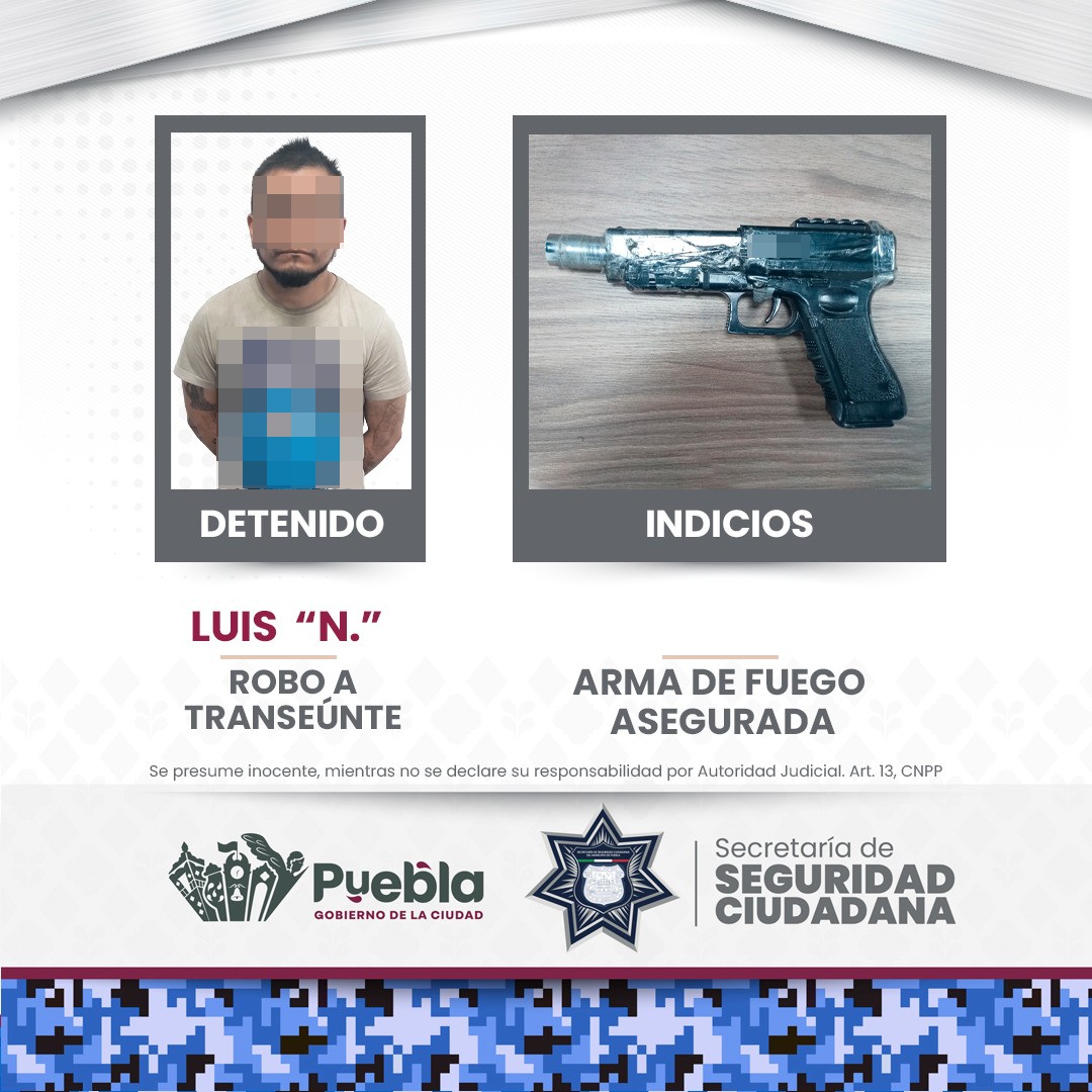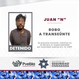 En una segunda acción, sobre calles de la colonia Galaxia Bosques de Amalucan, uniformados aseguraron a Juan “N”, de 32 años de edad, por presunto robo a transeúnte.