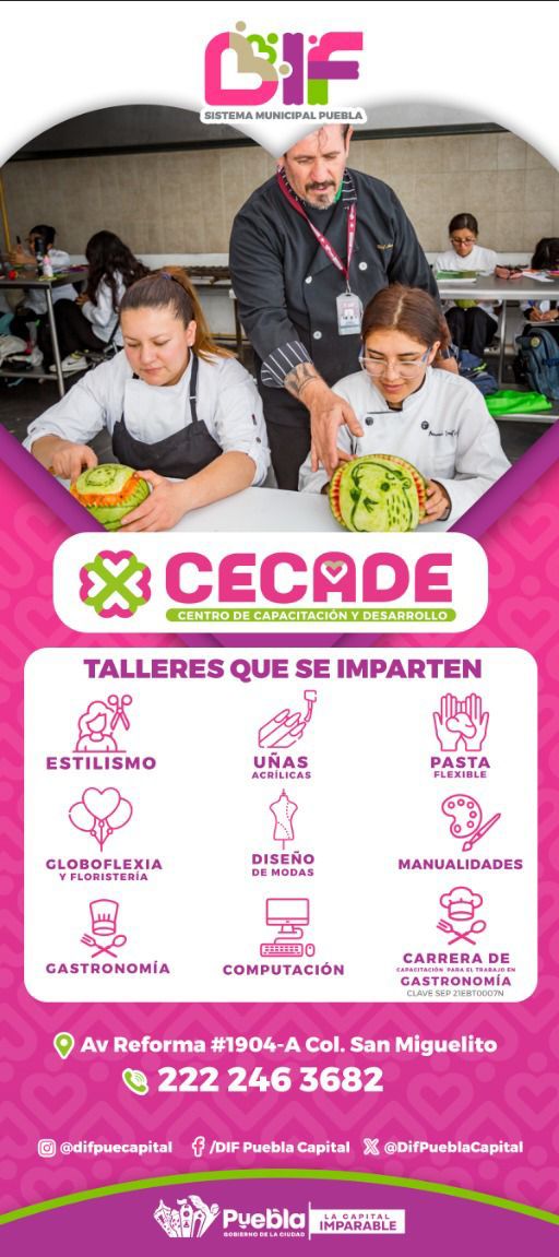 Puebla, Pue., 18 de mayo de 2025.– Con la finalidad de ofrecer una oportunidad de emprendimiento, el Sistema Municipal DIF (SMDIF), a través del Centro de Capacitación y Desarrollo (CEDADE), invita a las y los poblanos a inscribirse a sus talleres de gastronomía, globoflexia, estilismo, uñas de acrílico, bisutería, pasta flexible, y más; ya que en los próximos días iniciarán actividades en sus diversas sedes de Av. Reforma, col. Centro; así como en las diferentes juntas auxiliares.