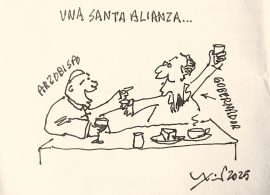 Después de una animada plática, ambos vuelven a tomar el micrófono. Después de las 6 de la tarde, el Arzobispo Espinosa Sánchez agradece nuevamente al Gobernador su presencia, repite que son amigos y recuerda que hace algún tiempo, con sus amigos periodistas prácticamente “destapó” a Armenta como el más indicado para ser el candidato al Gobierno y después ganador de la elección.