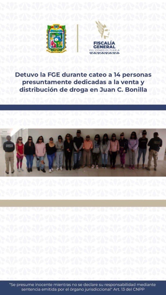 PUEBLA.-Junio 1 del 2025.-Como resultado de las acciones para combatir frontalmente la venta y distribución de droga, la Fiscalía General del Estado realizó un cateo en el municipio de Juan C. Bonilla, donde fueron detenidas 14 personas en posesión de droga.