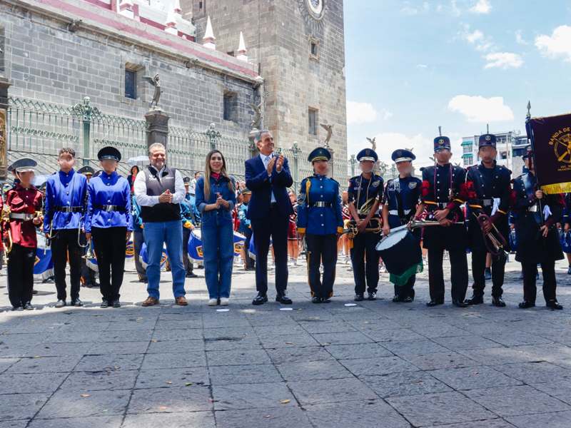 Puebla, Pue.- 12 de julio de 2025.- Para promover los valores en la juventud poblana, y como parte de las acciones que desarrolla el Gobierno de la Ciudad para mantener el orden, el presidente municipal, Pepe Chedraui Budib, encabezó una exhibición de bandas de guerra a un costado de la Catedral.