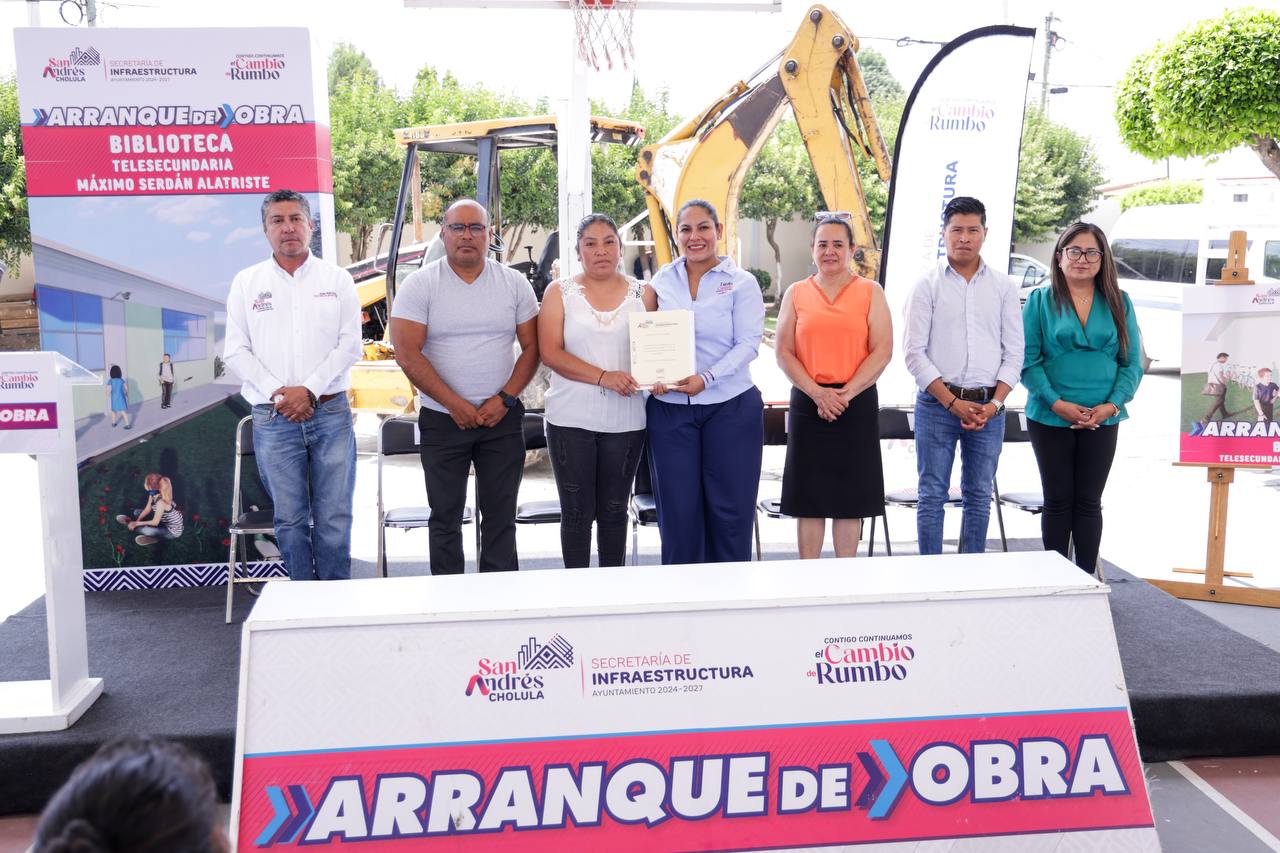 San Andrés Cholula, Puebla. – Con el objetivo de mejorar las condiciones de espacios educativos y contribuir a incentivar un mejor aprovechamiento escolar, la presidenta municipal Lupita Cuautle Torres, colocó la primera piedra de la nueva biblioteca en la Telesecundaria «Máximo Serdán Alatriste», ubicada en la junta auxiliar de San Rafael Comac.