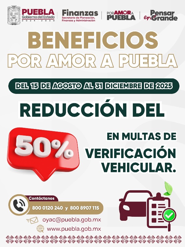 CIUDAD DE PUEBLA, Pue.-Agosto 15 del 2025.- Con el propósito de promover el cumplimiento de la verificación vehicular, el Gobierno del Estado de Puebla otorgará una reducción del 50 por ciento en las multas por no aprobar la verificación vehicular de gases contaminantes y en las multas por la verificación extemporánea.