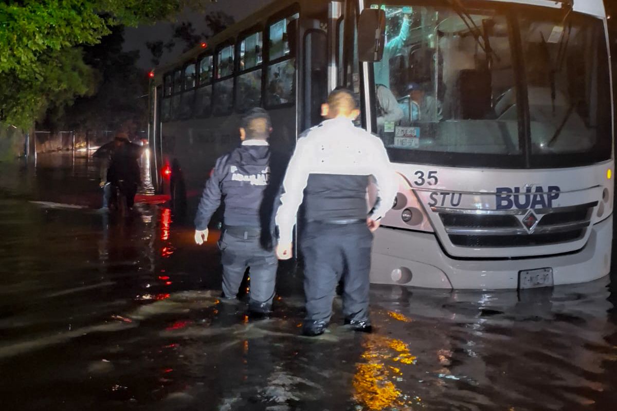 CIUDAD DE PUEBLA, Pue.- En cumplimiento al compromiso del gobernador Alejandro Armenta de servir con humanismo, construir paz y proteger a las familias poblanas, elementos de la Policía Auxiliar asignados a la supervisión nocturna, brindaron apoyo a un autobús con estudiantes de la Benemérita Universidad Autónoma de Puebla (BUAP) y a un vehículo particular, los cuales presentaron fallas mecánicas y quedaron varados tras la inundación registrada sobre el boulevard Vicente Suárez provocada por las fuertes lluvias.