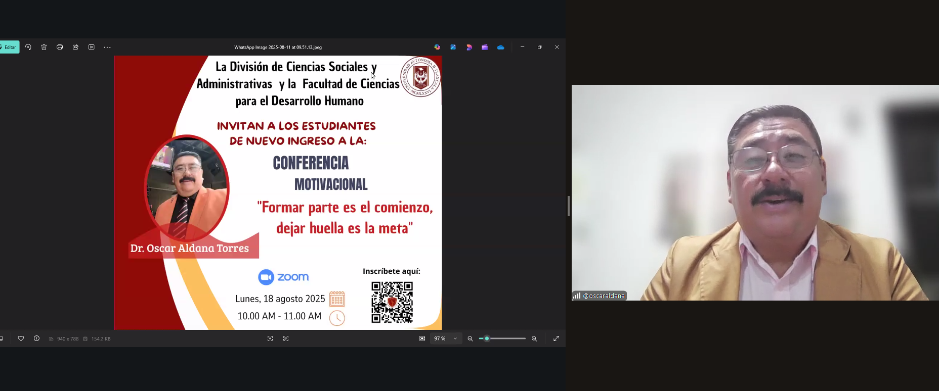 Para inspirar a los estudiantes de nuevo ingreso a construir un proyecto de vida con sentido, propósito y compromiso social, la Coordinación de Ciencias Sociales y Administrativas de la Universidad Autónoma de Tlaxcala (UATx) organizó la conferencia virtual “Formar parte es el comienzo, dejar huella es la meta” que impartió el Doctor Oscar Aldana Torres, quien invitó al diálogo a través de la pregunta detonadora: ¿Existe la fórmula del éxito?.