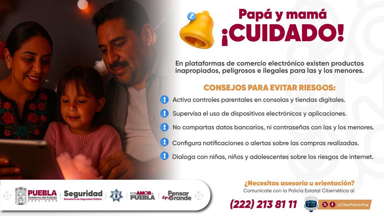 CIUDAD DE PUEBLA, Pue.- El Gobierno del Estado de Puebla, a través de la Secretaría de Seguridad Pública (SSP), alerta a madres y padres de familia sobre los riesgos que existen para menores de edad en las plataformas de comercio electrónico.