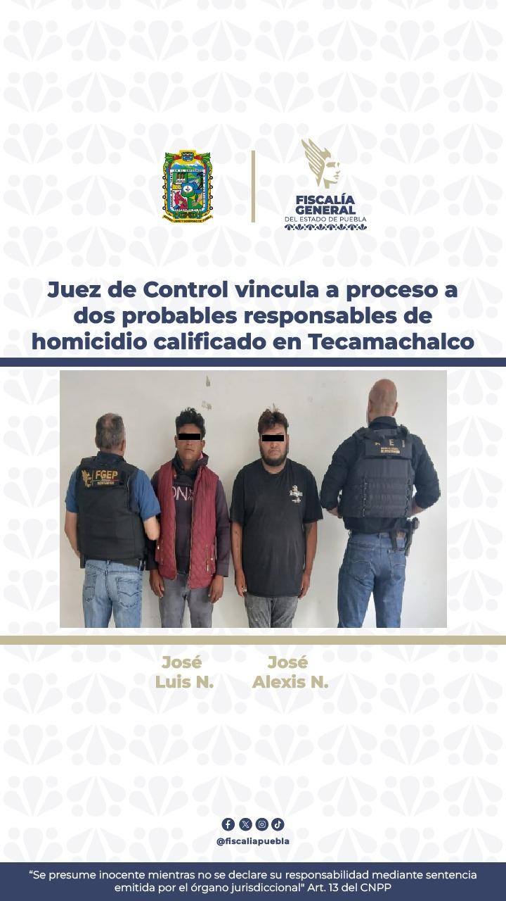 La Fiscalía General del Estado de Puebla informa que con base en datos de prueba aportados, el Juez de Control vinculó a proceso a José Alexis N. y a José Luis N., por su probable responsabilidad en la comisión del delito de homicidio calificado en agravio de un masculino en Tecamachalco, Puebla.