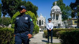 Las y los elementos realizan labores de vigilancia, recorridos pie-tierra y patrullajes preventivos, además de brindar orientación y apoyo en los accesos y alrededores de los camposantos.