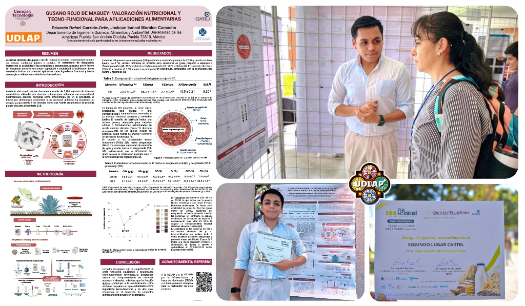 Cholula, Puebla; a 28 de diciembre de 2025.- Eduardo Rafael Garrido Ortiz, estudiante del Doctorado en Ciencia de Alimentos de la Universidad de las Américas Puebla (UDLAP), obtuvo el segundo lugar en el concurso de exposición de carteles del Foro Tecnológico Plant Based Protein Innovation 2025, evento que tuvo como objetivo buscar nuevas alternativas sostenibles y ecológicas que mejoren ciertas propiedades en los alimentos.