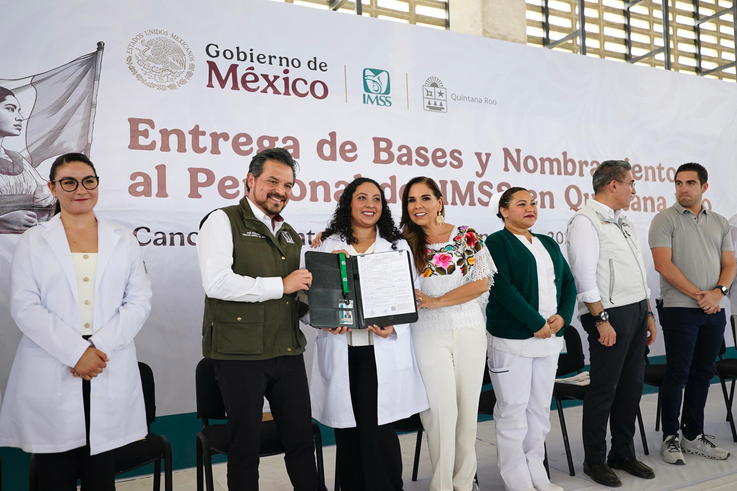 Durante la ceremonia oficial, realizada en el Domo Deportivo Parque de Los Gemelos en Cancún, el director general del IMSS, Zoé Robledo, y la gobernadora de Quintana Roo, Mara Lezama Espinosa, entregaron de manera simbólica 10 basificaciones que representan el esfuerzo y dedicación de las y los trabajadores de la salud.