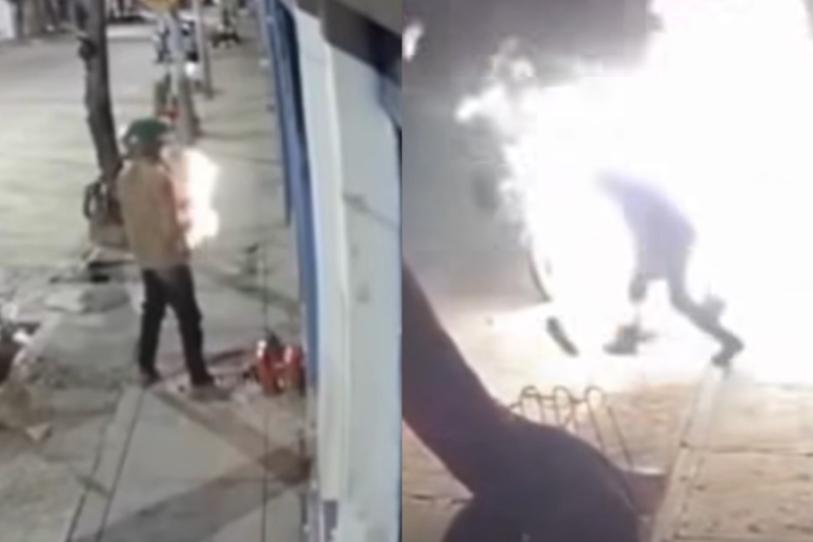 Las imágenes captadas, muestran el momento en que las llamas le alcanzan los brazos y las piernas del delincuente.Captura de imagen