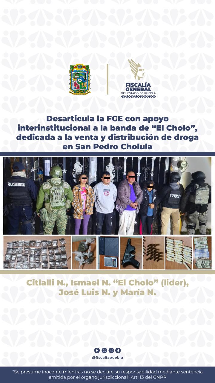 Como resultado de labores de inteligencia y trabajo de campo, la Fiscalía General del Estado (FGE), con apoyo interinstitucional, desarticuló la banda conocida como “El Cholo”, tras la detención de su presunto líder y tres integrantes más, quienes estarían relacionados con la venta y distribución de droga en el municipio de San Pedro Cholula; asimismo, se aseguró droga y un inmueble utilizado como punto de operación.