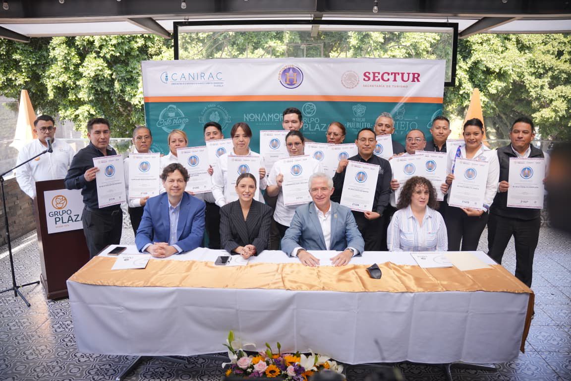 CIUDAD DE PUEBLA, Pue.- Con el objetivo de fortalecer la calidad sanitaria y elevar la competitividad del sector restaurantero, la Secretaría de Desarrollo Turístico entregó 16 Distintivos H a empresas que acreditaron altos estándares en manejo higiénico de alimentos, capacitación constante y responsabilidad sanitaria. Durante el acto se reconoció de manera especial a Grupo Plaza como referente de hospitalidad y excelencia en el estado.