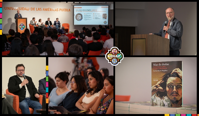 Cholula, Puebla, a 1 de marzo de 2026.- La Universidad de las Américas Puebla (UDLAP) se convirtió en un punto de encuentro para debatir los grandes temas de la agenda global al recibir al destacado internacionalista y analista político Carlos Bravo Regidor, quien ante la comunidad universitaria desmenuzó las ideas de su más reciente libro, Mar de dudas: conversaciones para navegar el desconcierto, en un ejercicio que combinó el rigor académico con un dinámico intercambio de ideas.