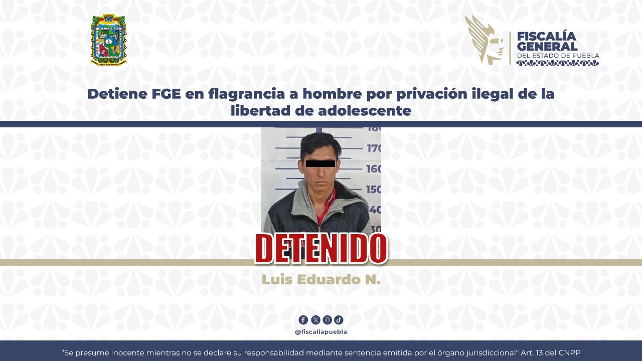 Estado de Puebla (FGE) detuvo en flagrancia a Luis Eduardo N., de 31 años, por su probable