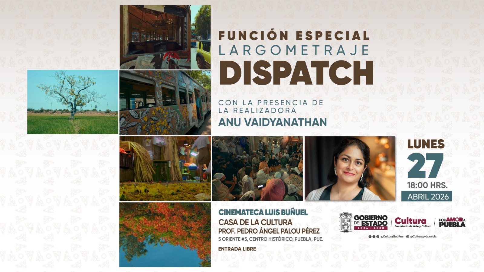 CIUDAD DE PUEBLA, Pue. – La realizadora hindú Anu Vaidyanathan visitará la ciudad de Puebla el próximo lunes 27 de abril, para presentar su largometraje “DISPATCH” en una función especial que se llevará a cabo en la Cinemateca “Luis Buñuel”, ubicada dentro de la Casa de la Cultura “Profesor Pedro Ángel Palou Pérez”.