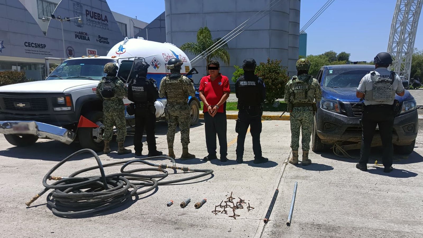 Además, en el lugar de los hechos las fuerzas de seguridad localizaron una camioneta de color azul, dispositivo de punción de neumáticos, una manguera y adaptadores para gas, presuntamente utilizados para el robo de combustible.